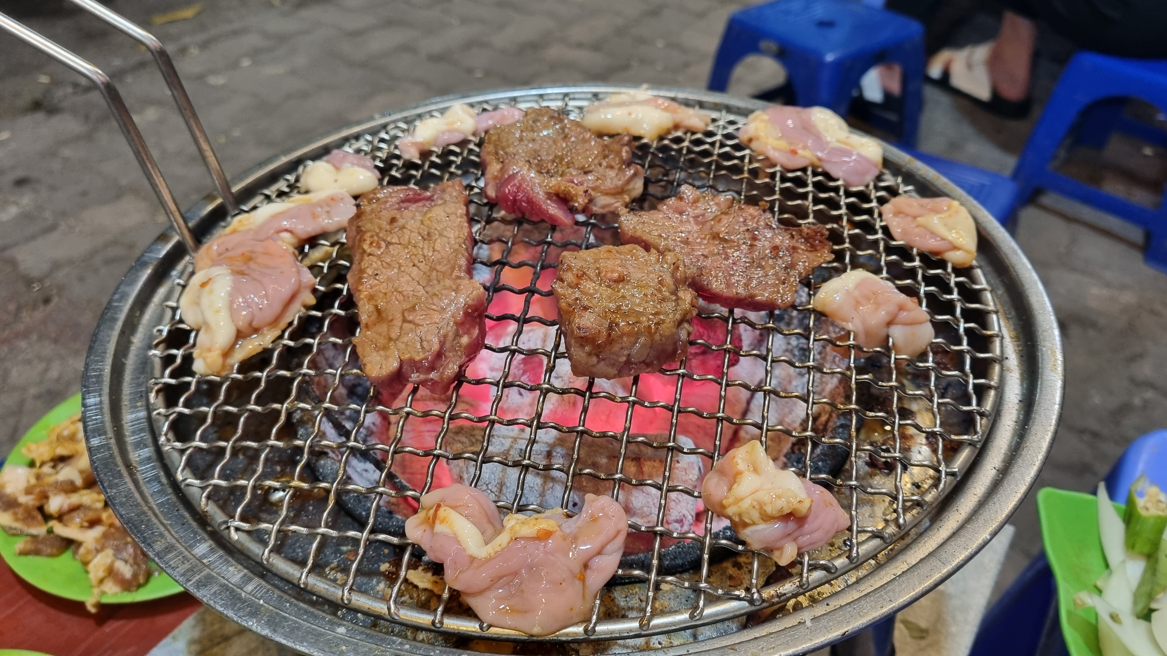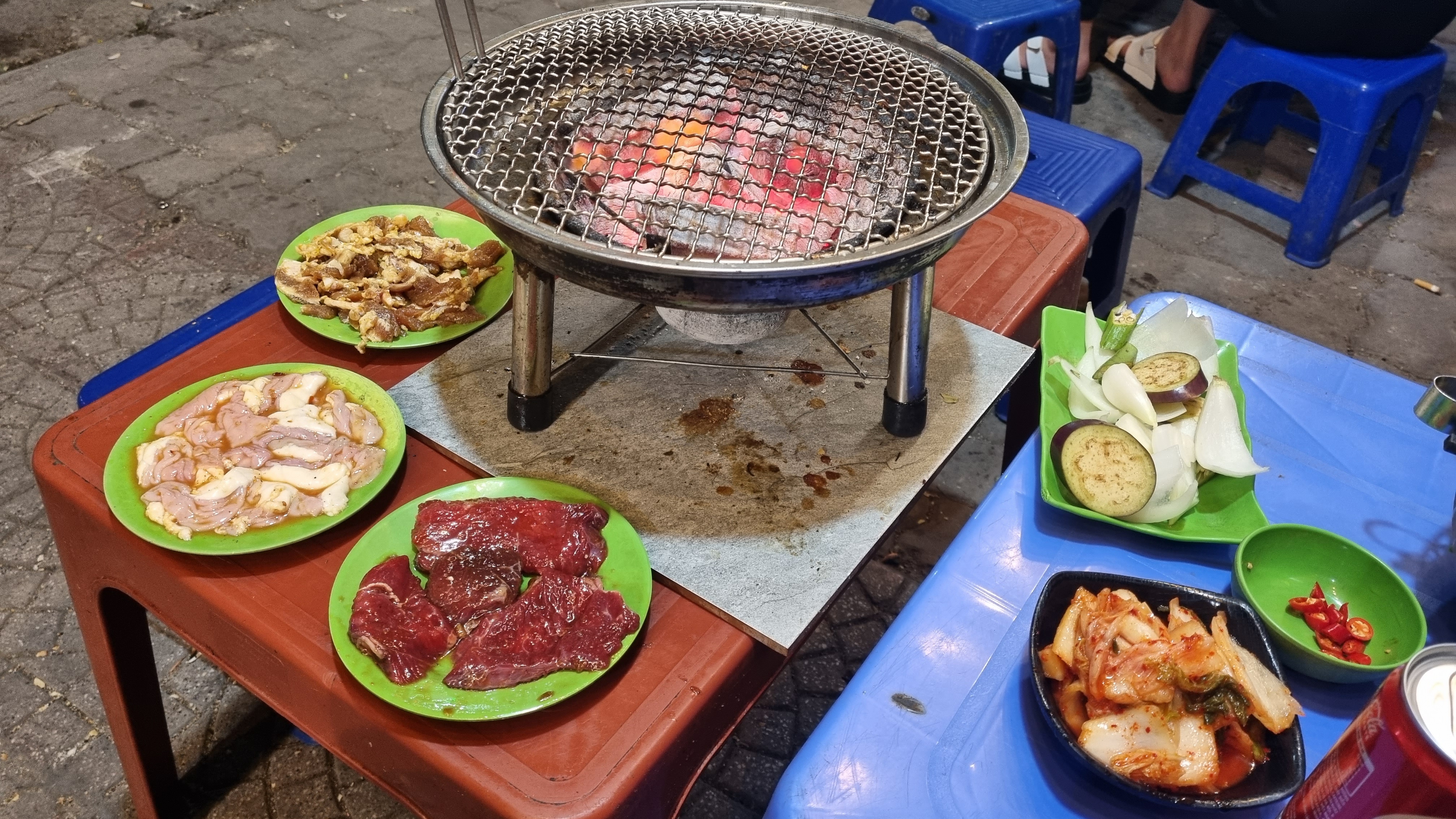 기본으로 주어 지는 것은 오직 숯불과 젓가락뿐이며 다른 모든 건 주문을 하면 하나씩 가져다줍니다. 김치도 사 먹고 고기도 이것저것 주문하여 숯불에 구워 먹을 수 있습니다. 앉아서 먹는 동아 옆에서 자동차들이 경적을 울리며 돌아다니고 엄청 돈 많은 거지 같은 느낌을 느낄 수 있습니다 ㅋㅋㅋㅋ