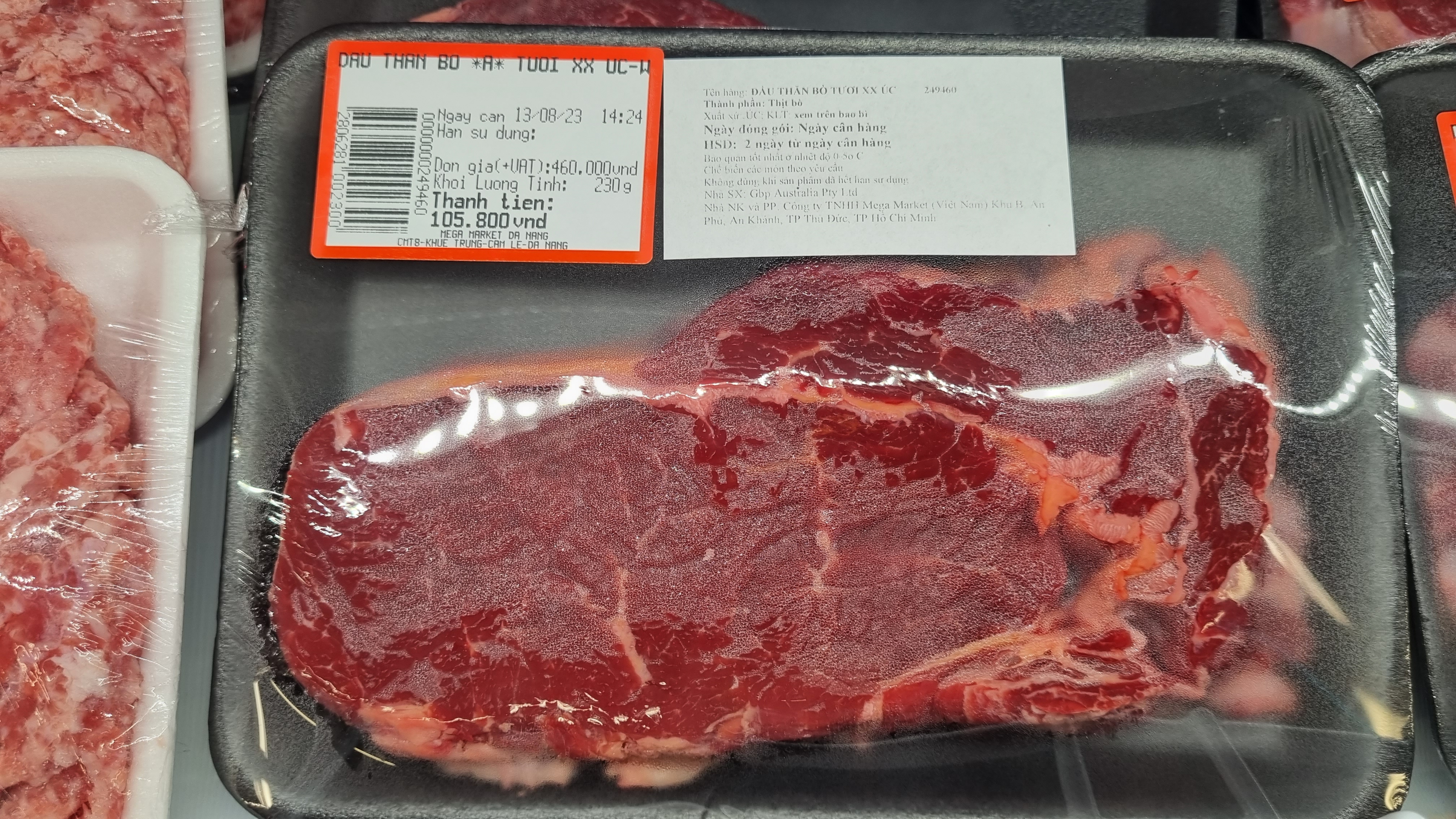 소고기 등심입니다. 230그램에 10만 동 5천 원입니다. 스테이크 한 장 구워 먹어도 오천 원 이면은 먹을 수 있어요 물론 불판이 있어야 한다는 조건이 있지만 한국에서는 놀랄만한 가격의 고기 가격인 거 같습니다. 그런데 여행을 하면서 먹어본 결과 베트남의 소는 방목으로 키우고 품종이 달라서 그런지 소고기의 맛은 나지만 굉장히 질겨서 우리가 상상하는 그런 맛은 나지 않습니다.