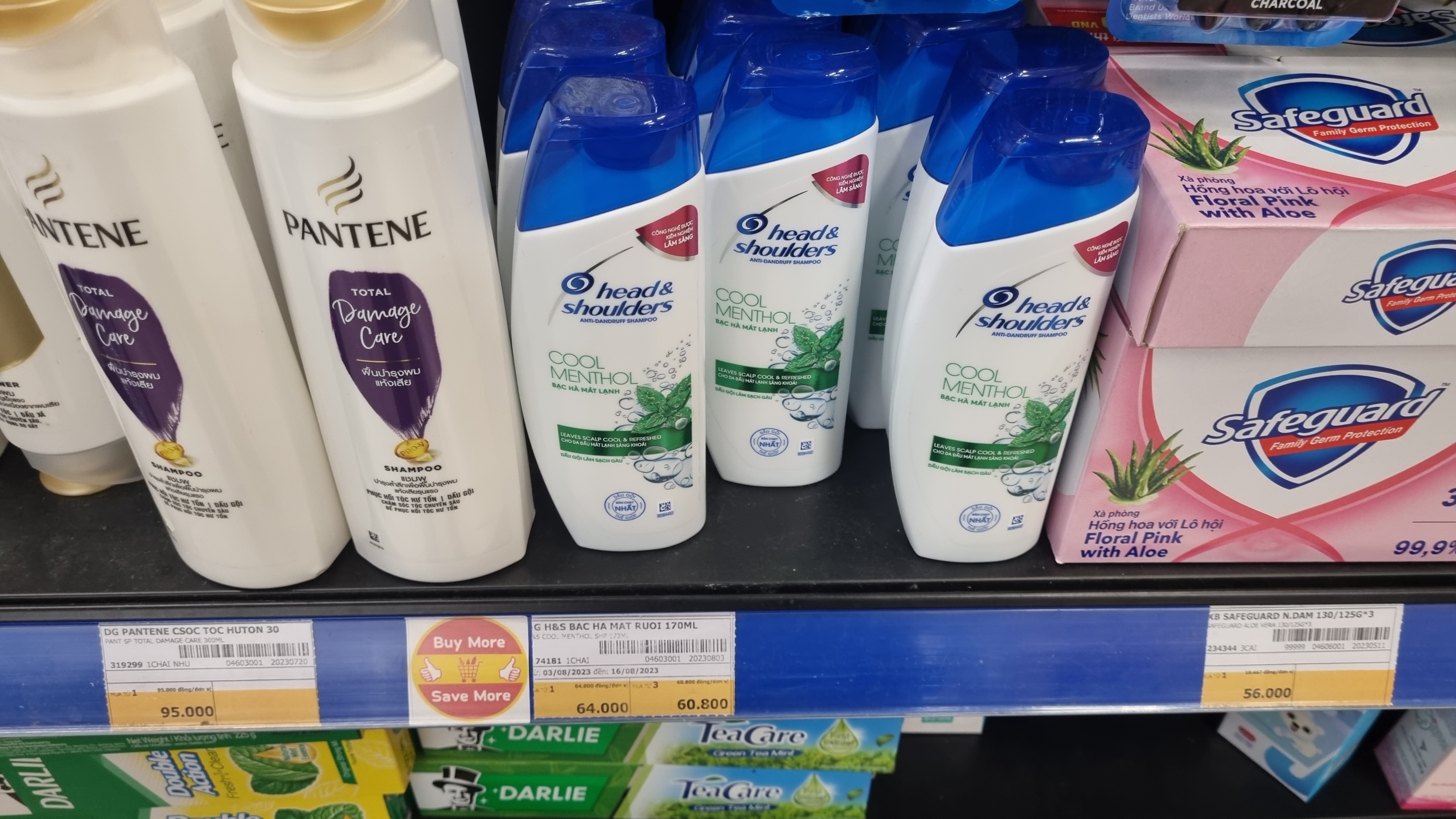 한국에서는 마트 안에 들어가면 사이즈가 너무 크면 한쪽에서는 가구들도 팔고 전자제품 팔고 다이소도 들어있고 하는데 다낭의 마트는 그런 거 없이 오로지 정말 물건들만 가득 진열되어 있습니다. 사진에서 처럼 샴푸만 하더라도 같은 상표의 제품인데도 종류가 다르고 색이 다르고 정말 없는 물건이 없을 거 같은 모양입니다.