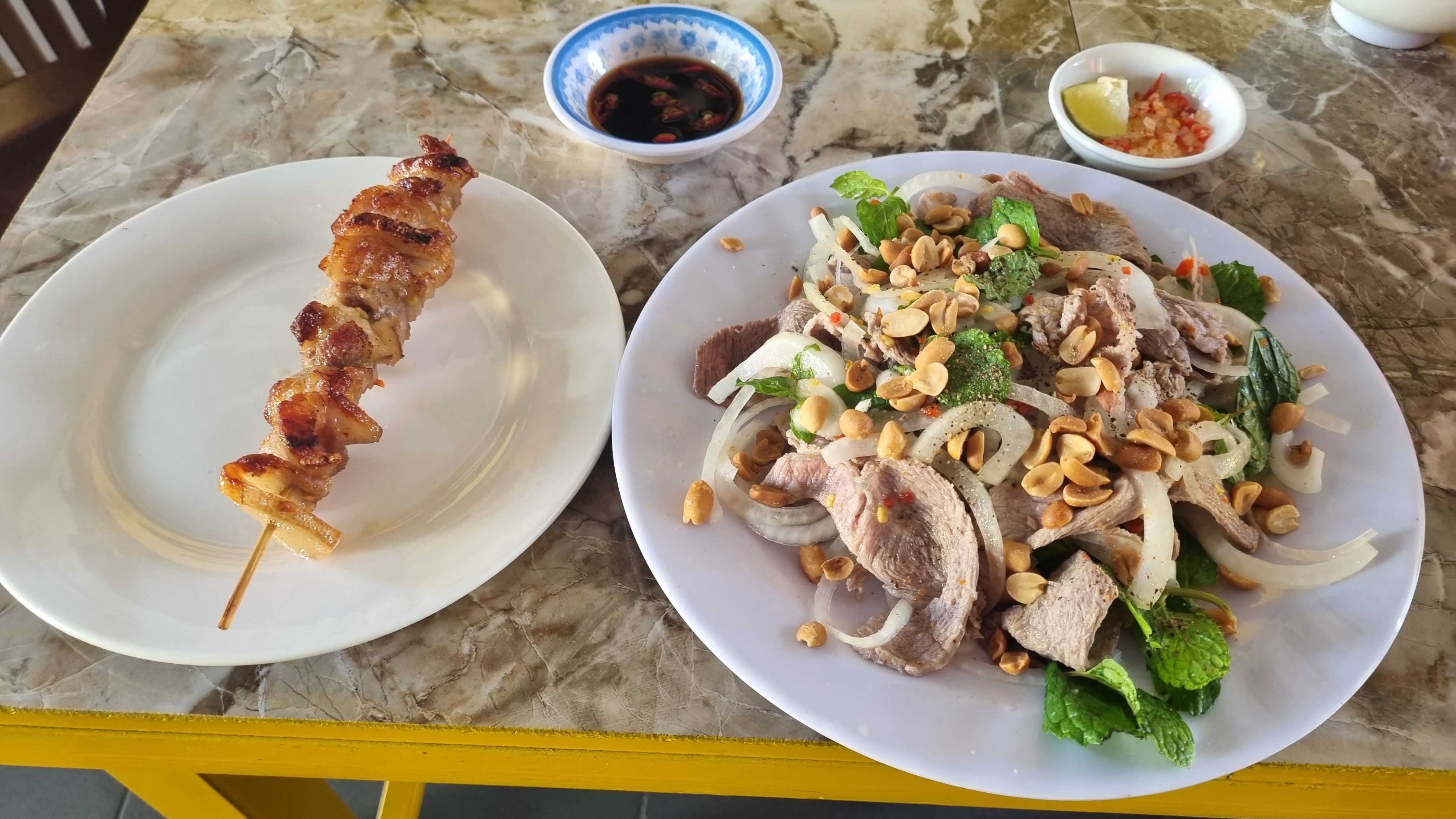 꼬치구이를 시켰는데 꼬치 한 개가 나올 줄이야.. 그리고 삶은 고기를 야채와 땅콩으로 버무린 샐러드 하나 먹고 여기선 이것만 먹고 나가서 다른 거 먹자 라는 생각에 이번엔 지도를 켜고 꼰뚬의 중심가로 나가 보았습니다.