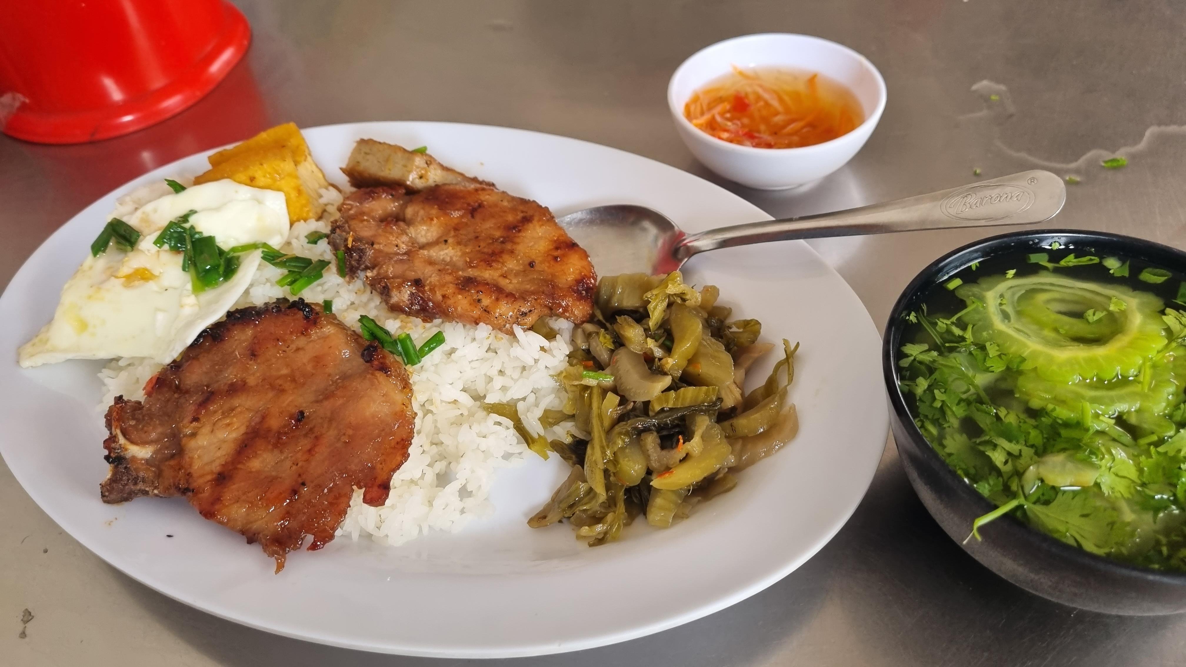 저는 계란 구운 고기, 두부를 선택했고 김치 볶음 같은 야채 볶음과 풀국은 기본 반찬으로 나오는지 같이 주셨습니다. 한국에서 식당을 가면 나오는 푸짐한 반찬들에 익숙해져 있는데 한국같이 생각하고 반찬 이거 저거 다 담으면 한 끼 식사가 베트남에서 7천 원이 넘는 신기한 경험도 할 수 있습니다.