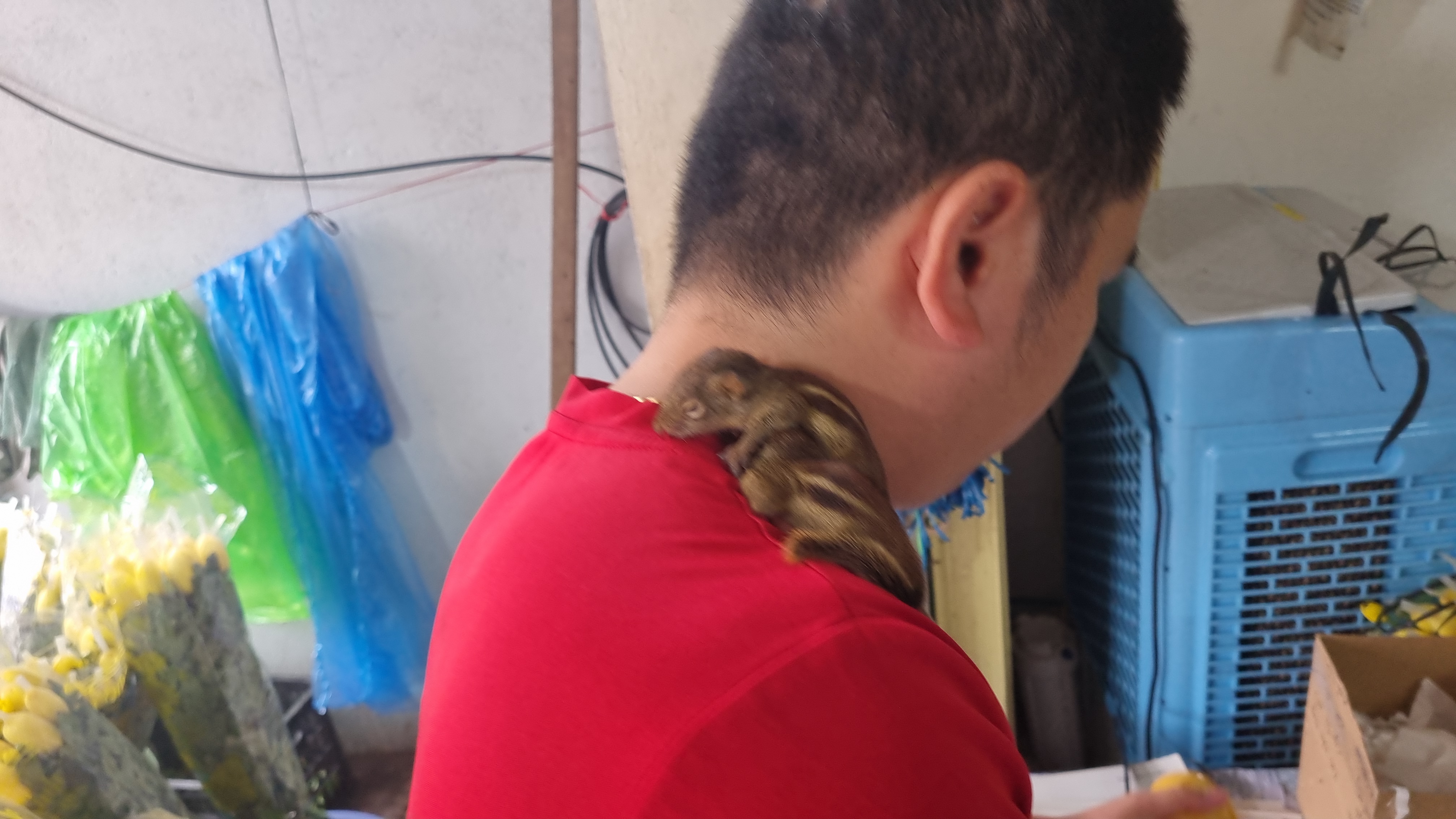 망고를 깎아주는 아저씨 어깨에 뭔가 이상한 게 있어서 봤더니 다람쥐입니다. 아저씨를 아빠라 생각하는지 망고를 줍고 망고를 깎고 하면서 어깨가 많이 흔들리는데 왼쪽으로 갔다 오른쪽으로 갔다 어떻게든 어깨 위에 자리를 잡고 떨어지지 않습니다. 우리나라였으면 아마 동물농장에 나왔을 거예요
