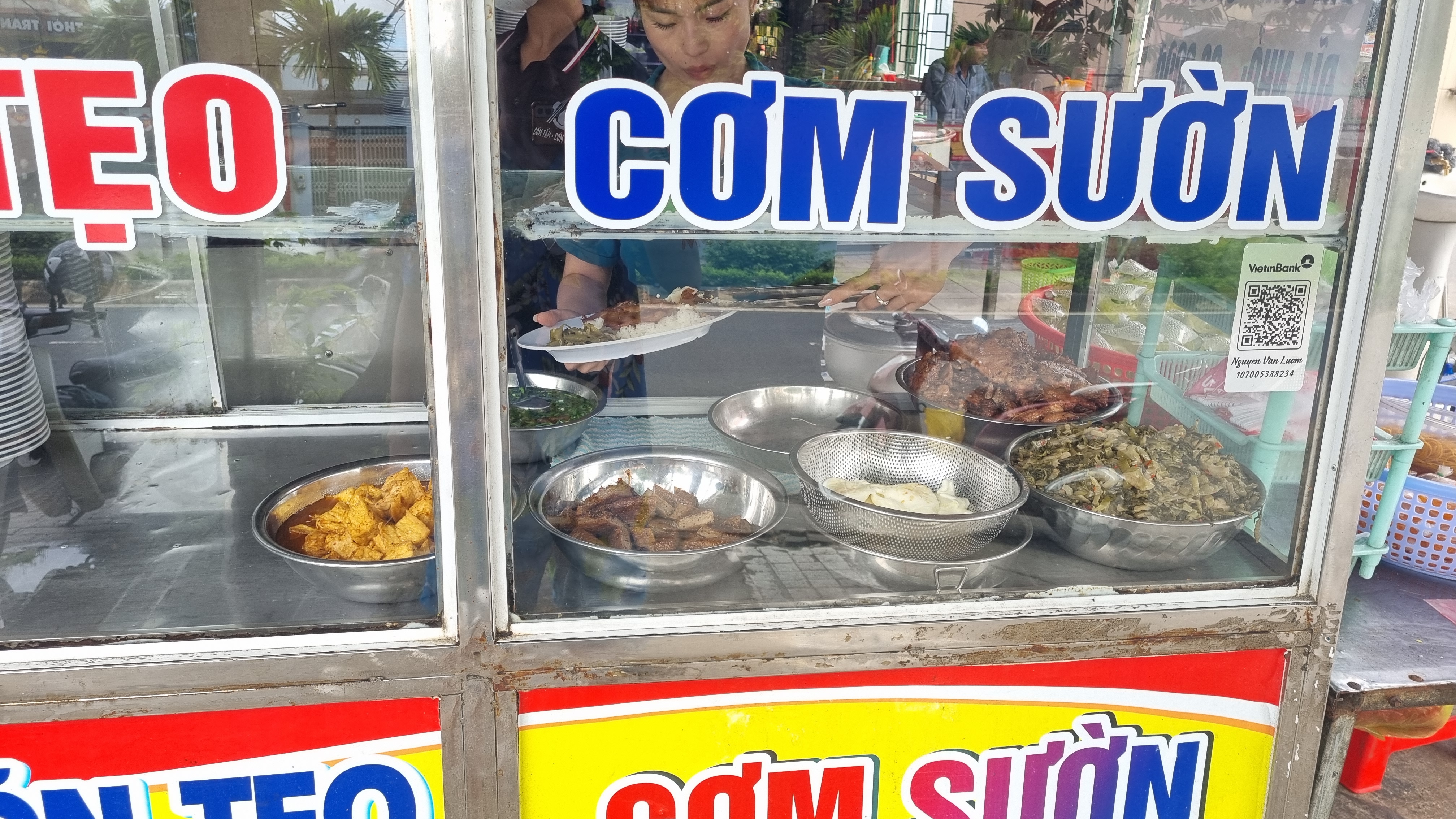 간단히 과일로 주린배를 진정을 시켜 놓았으니 이제 진짜 밥을 먹으러 가야지요 과일은 애피타이저? 베트남 가정식 종류인 껌승을 먹으러 왔습니다. 여기는 도시락 가게 같은 주문 방식입니다. 손님이 오면 일단 접시에 밥을 올려 둡니다. 그리고 손님이 반찬을 하나씩 콕콕 집으면 미리 만들어 놓은 반찬을 밥 위에 올려줍니다.